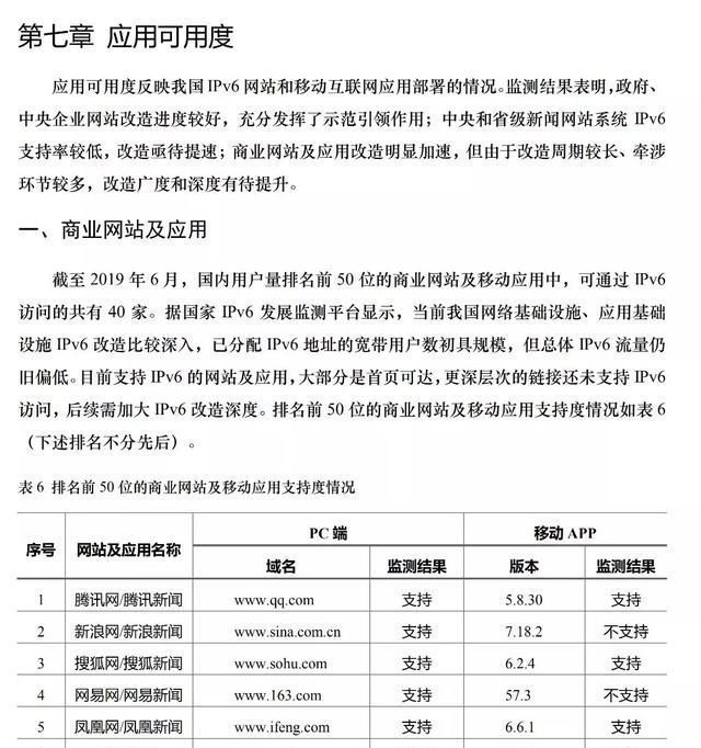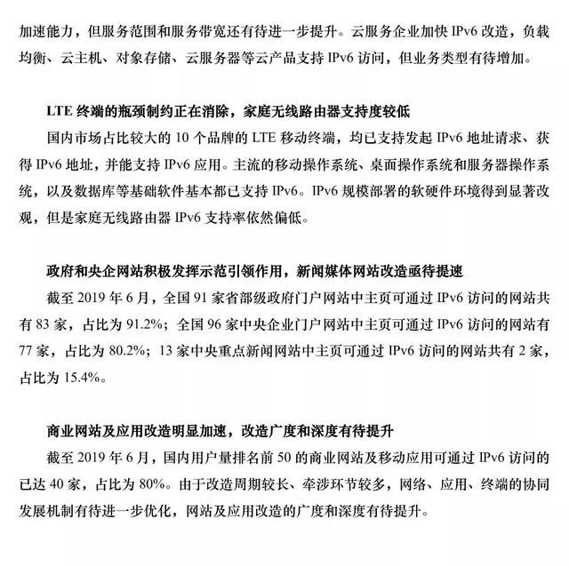 截至2019年6月,国内用户量排名前50的商业网站及移动应用可通过ipv6访问的已达40家,占比为80%,我国ipv6规模部署工作取得了显著成效。