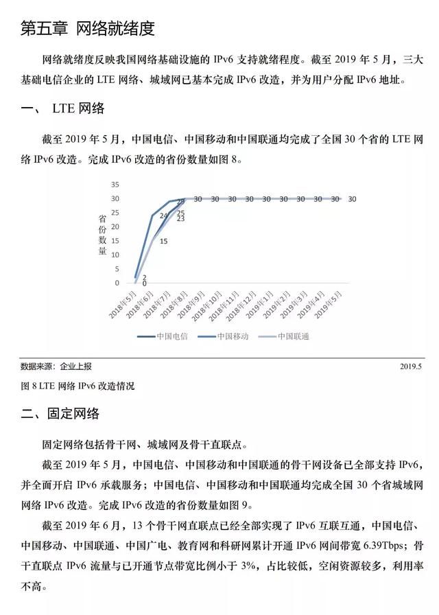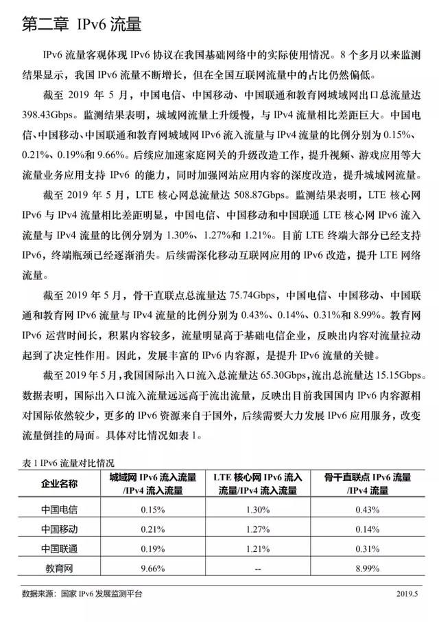 截至2019年5月,三大基础电信企业城域网出口总流量达398.43gbps,lte核心网总流量达508.87gbps,骨干直联点总流量达75.74gbps,国际出入口的ipv6总流量达到80.45gbps。